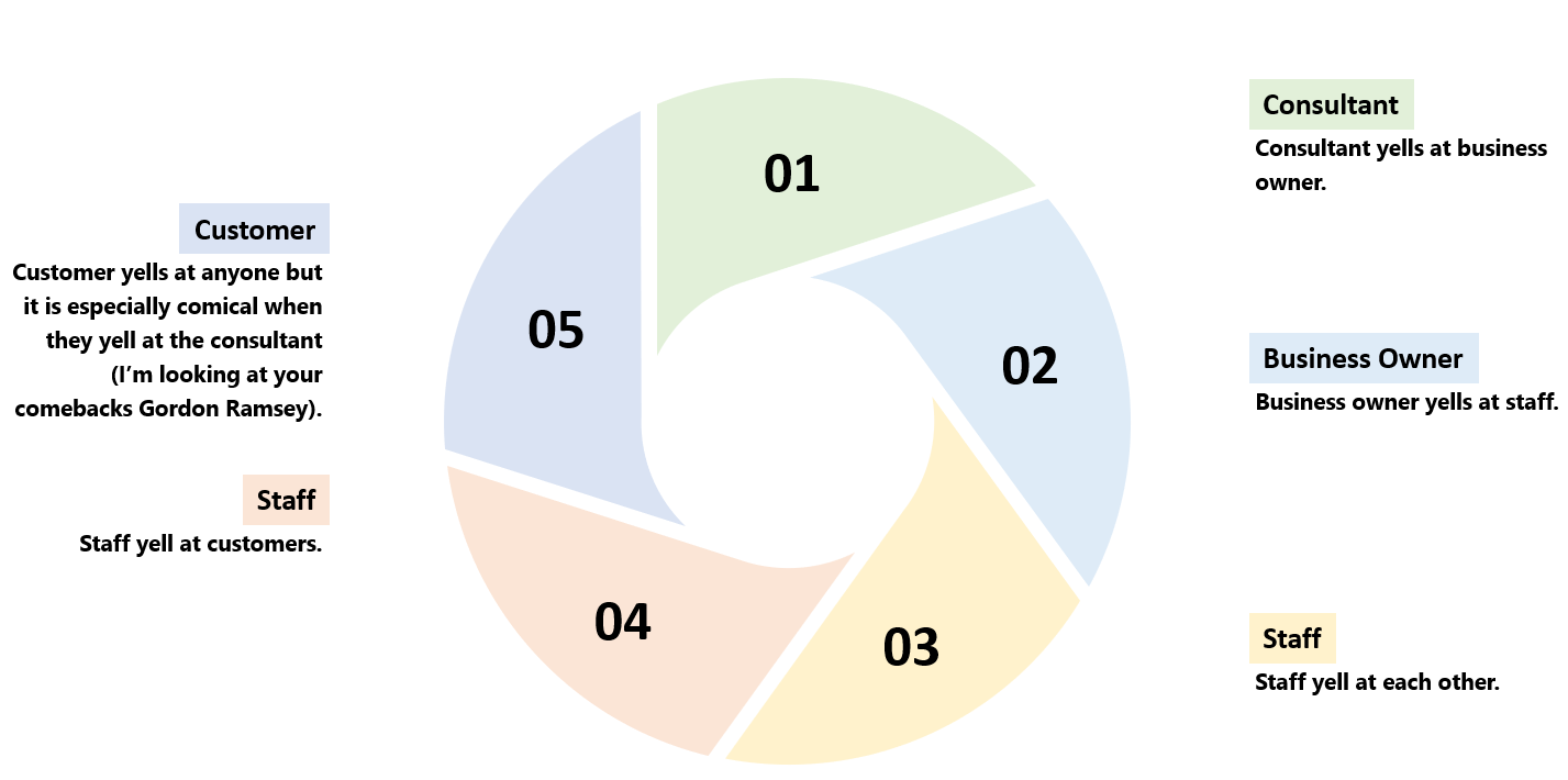 A consultant comes into a business and usually gets into a screaming match with the owner and staff over something like their lack of initiative or ambition. Meanwhile we have usually watched 20 minutes of their employees smoking over a grill or using old towels to dry someone’s hair, all the while screaming and yelling at each other.